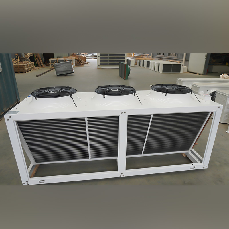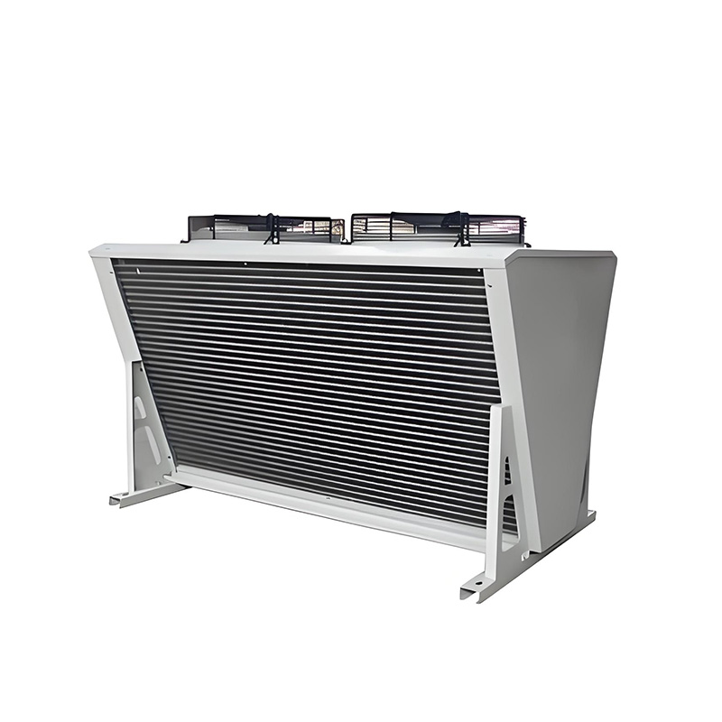 The V-shaped condenser is a classic and efficient structural form of air-cooled condenser, characterized by symmetrically arranging two sets of condensing coils at a certain angle (usually 60 ° or 90 °), forming a "V" - shaped structure when viewed from the front. This design cleverly utilizes limited space and significantly increases the effective heat transfer area. When working, the fan is usually installed at the top or bottom of the "V" - shaped structure, driving the ambient air to uniformly pass through the surfaces of the coils on both sides, and fully exchanging heat with the high-temperature and high-pressure refrigerant vapor inside the tubes, causing it to condense into liquid. The V-shaped structure not only has a compact structure and small footprint, which is conducive to the overall layout of the equipment, but also reduces ventilation dead corners, improves the uniformity and heat transfer efficiency of the air flow field, and has the characteristics of good dust removal and easy maintenance. Therefore, it is widely used in large commercial and industrial refrigeration equipment such as chillers and rooftop air conditioning units.