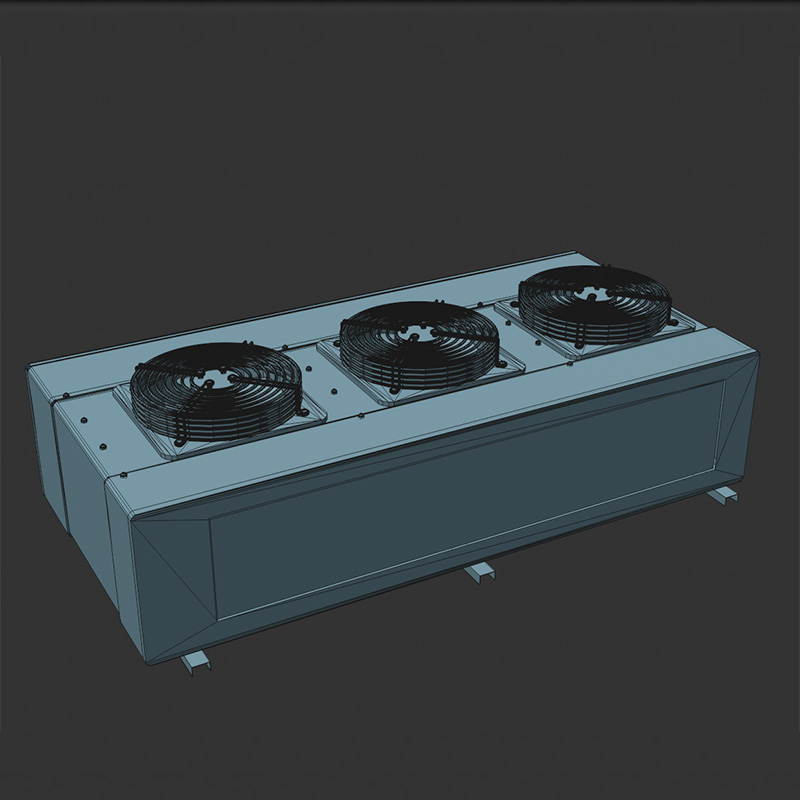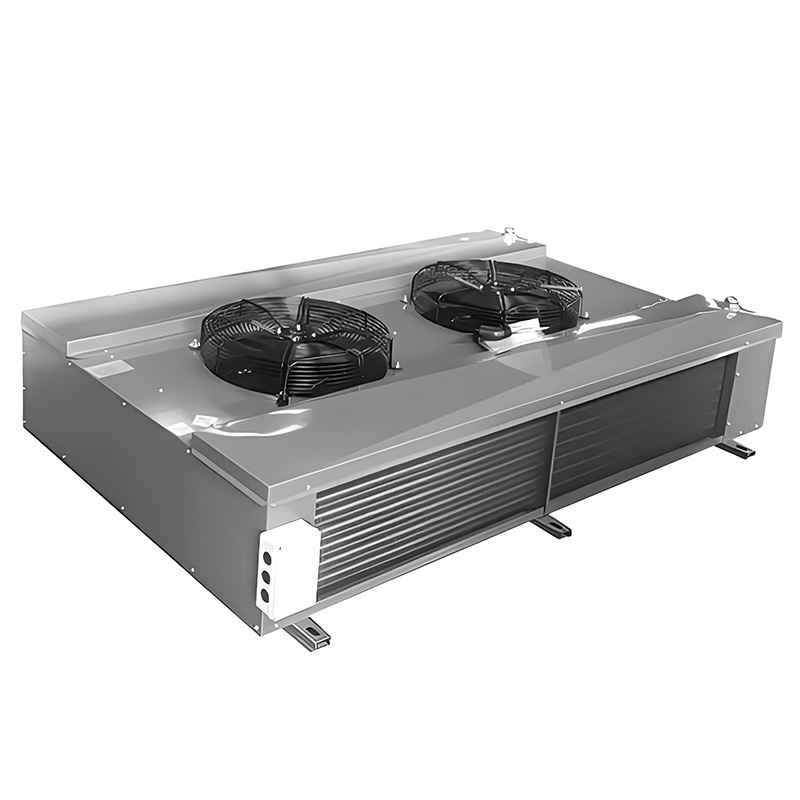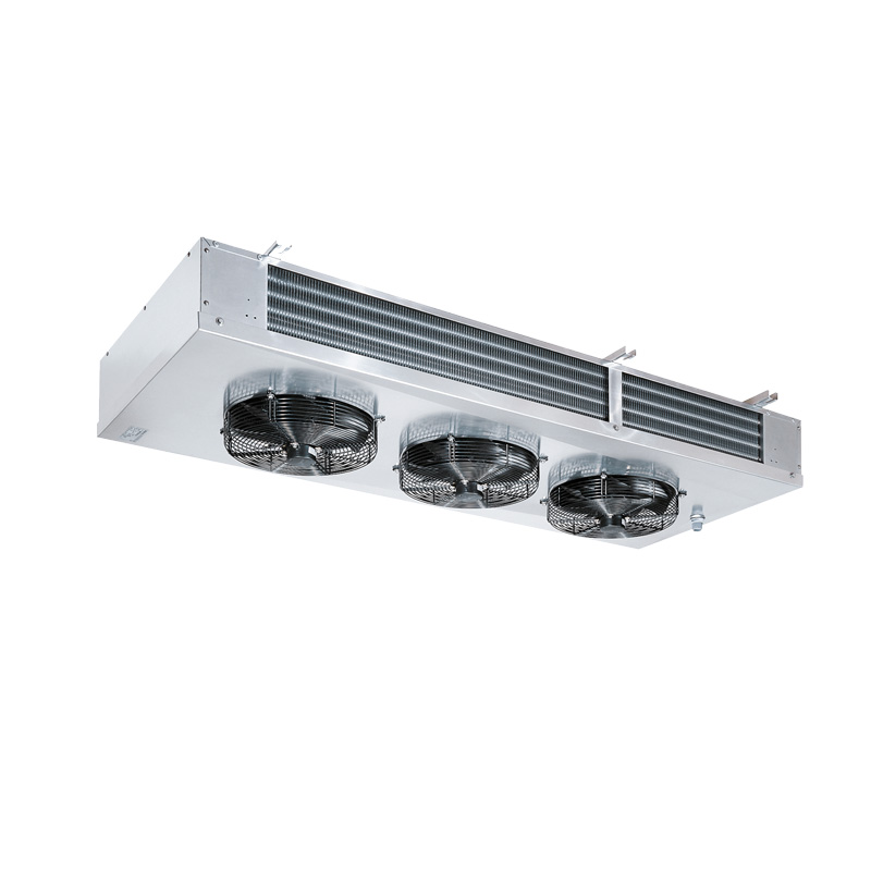 Double sided blowing air cooler is a cooling device used in food processing rooms as a matching tool. Adopting a 12.7 internally threaded copper tube fork arrangement and large wavy sine wave fins.