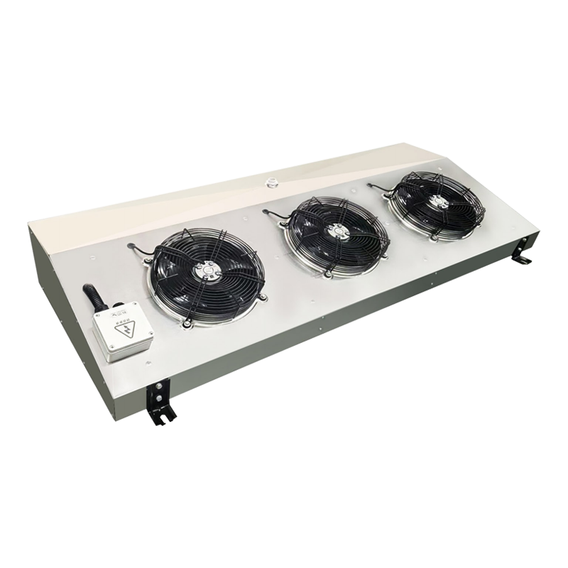 Angle type air coolers are suitable for cooling equipment with limited installation size inside the warehouse. They can be used to blow air from the single-sided fin side or from the inclined end motor side, in two ways.