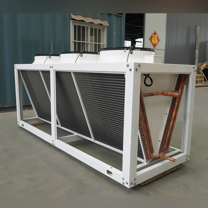 The V-shaped condenser is a classic and efficient structural form of air-cooled condenser, characterized by symmetrically arranging two sets of condensing coils at a certain angle (usually 60 ° or 90 °), forming a "V" - shaped structure when viewed from the front. This design cleverly utilizes limited space and significantly increases the effective heat transfer area. When working, the fan is usually installed at the top or bottom of the "V" - shaped structure, driving the ambient air to uniformly pass through the surfaces of the coils on both sides, and fully exchanging heat with the high-temperature and high-pressure refrigerant vapor inside the tubes, causing it to condense into liquid. The V-shaped structure not only has a compact structure and small footprint, which is conducive to the overall layout of the equipment, but also reduces ventilation dead corners, improves the uniformity and heat transfer efficiency of the air flow field, and has the characteristics of good dust removal and easy maintenance. Therefore, it is widely used in large commercial and industrial refrigeration equipment such as chillers and rooftop air conditioning units.